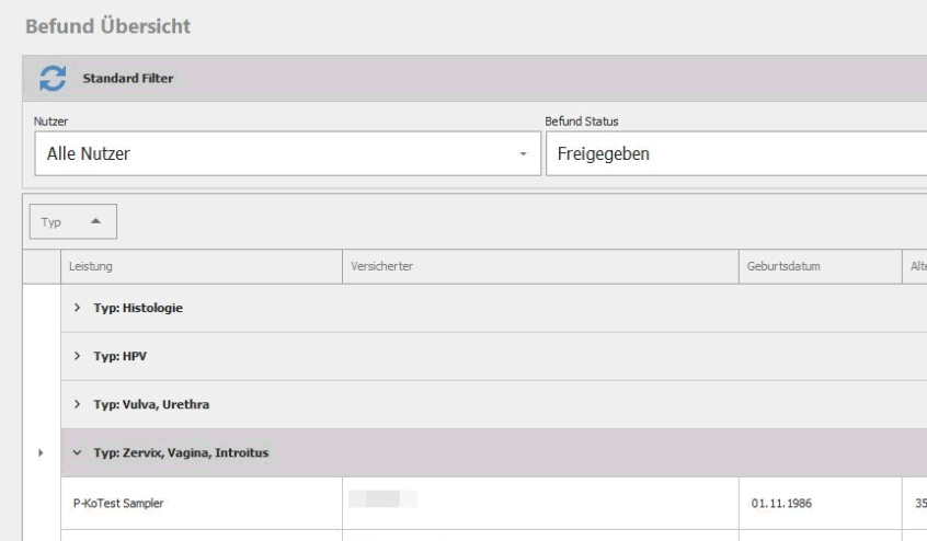 Die Gruppierungsfunktion (hier exemplarisch nach Befund-Typ) ermöglicht Ihnen die Daten in einer gewünschte Reihenfolge zu gruppieren oder klicken Sie auf die Spalte um nach dieser aufsteigend oder absteigend zu sortieren.