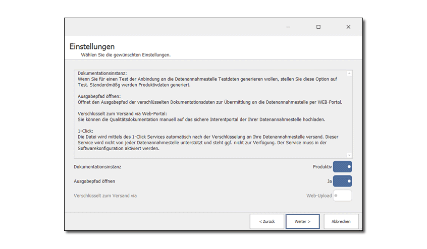 In 3 einfachen Schritten werden Sie durch die Erstellung Ihrer Dokumentation nach oKFE-RL geführt. Jeder Schritt wird mit erläuternden Texten erklärt und einzelne Optionen zur Erstellung werden abgefragt. Mit Abschluss des Assistenten werden die Dokumentationsdaten erstellt, nochmals geprüft und über das SNK der KV‘en an Ihre Datenannahmestelle versand. Alternativ haben Sie die Möglichkeit zum Export für einen manuellen Upload.